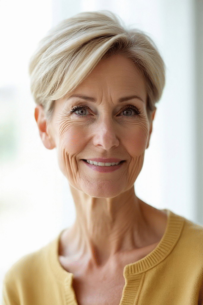 La combinación de un corte pixie con flequillo lateral en un cálido rubio arena crea un brillo favorecedor y soleado que es tanto juvenil como sofisticado. El flequillo lateral ayuda a suavizar las características angulares y puede peinarse para complementar varias formas de rostro.
