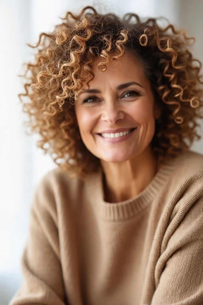 El corte rizado con mechas caramelo está diseñado para realzar los rizos naturales mientras agrega calidez y profundidad a través de la colocación estratégica del color. Este corte funciona con el patrón de rizo natural del cabello, creando un estilo hermosamente texturizado que celebra la textura natural en lugar de luchar contra ella.