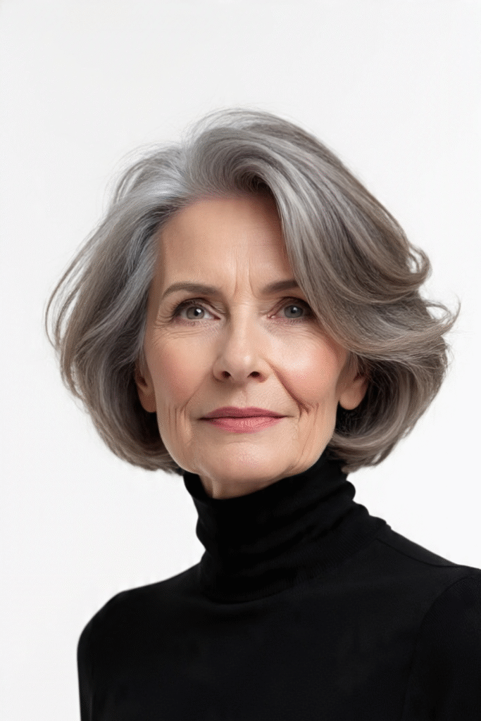 Abrazar el cabello gris natural con un bob redondeado o desigual crea una elegancia refinada que celebra la belleza del envejecimiento con gracia. Este estilo presenta capas ligeras y curvas suaves que funcionan armoniosamente con los tonos grises, creando un look sofisticado que es tanto moderno como atemporal.
