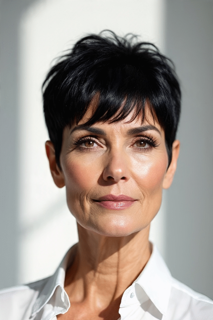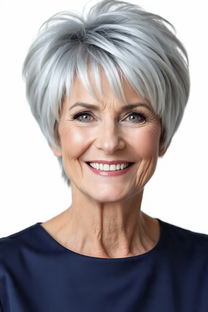 El corte pixie clásico sigue siendo uno de los peinados cortos más queridos para mujeres mayores de 60, y es fácil ver por qué. Este corte atemporal presenta cabello corto en la parte posterior y los lados con un poco más de longitud en la parte superior, creando una silueta bellamente equilibrada que resalta las características faciales.