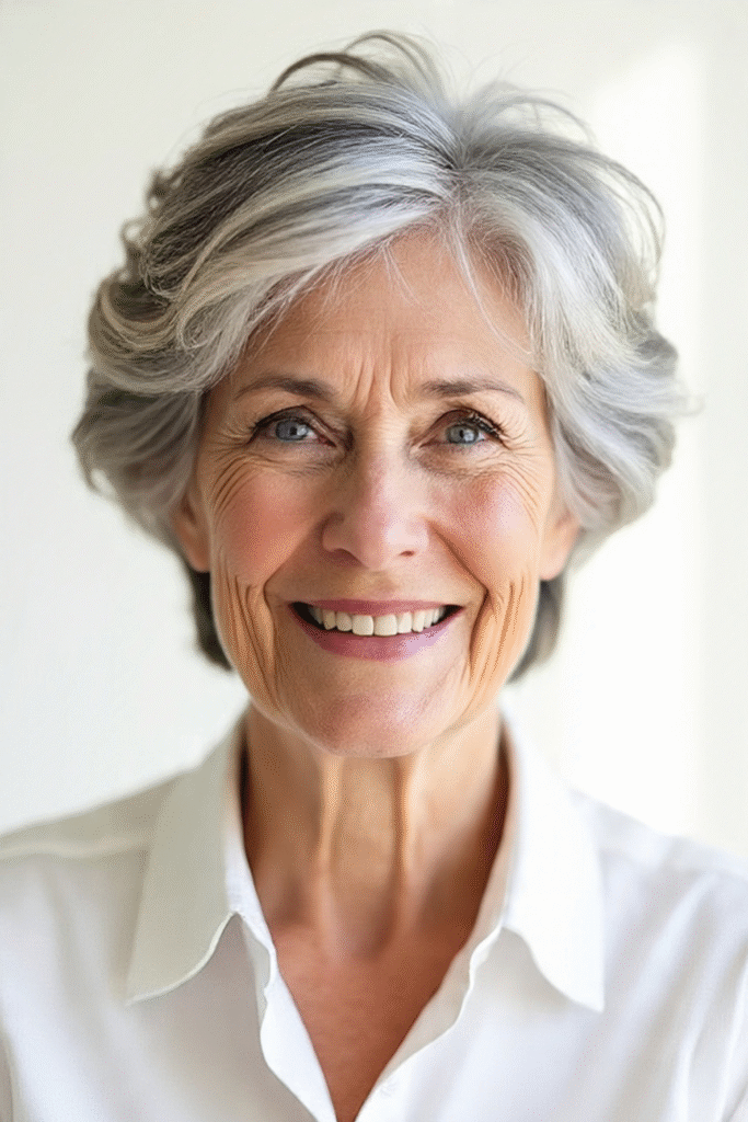 Este estilo funciona particularmente bien para mujeres que quieren abrazar su cabello gris mientras mantienen una apariencia juvenil y enérgica.