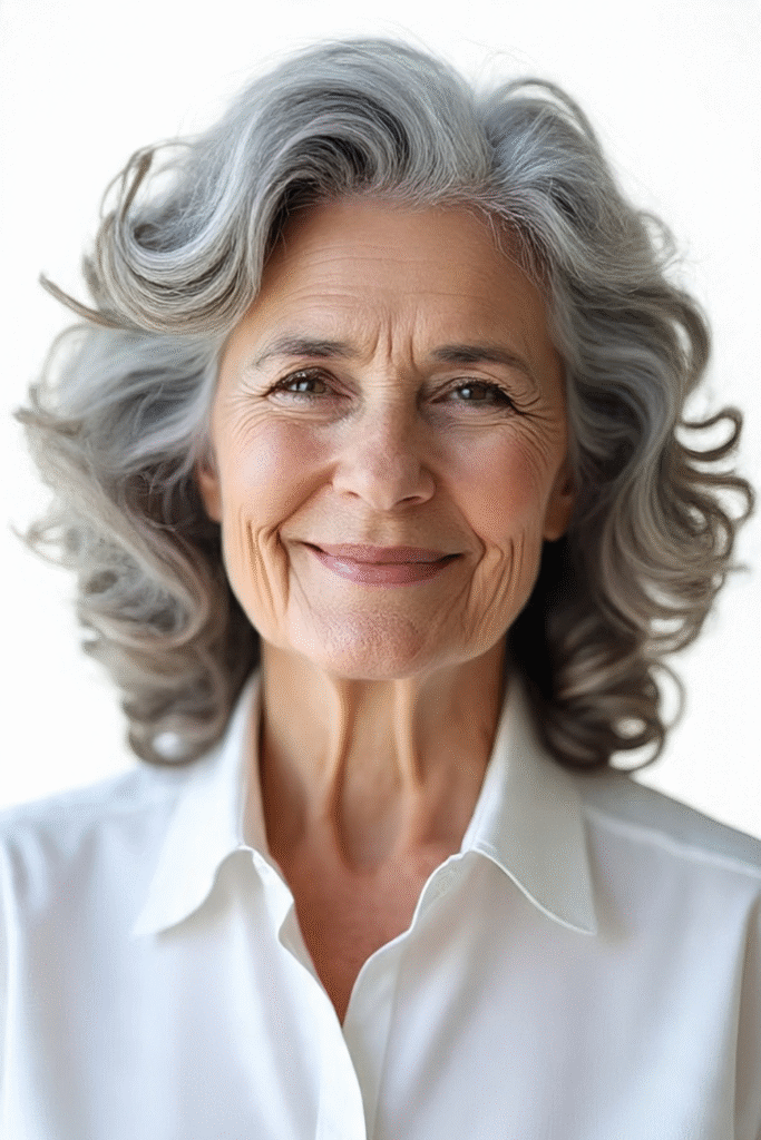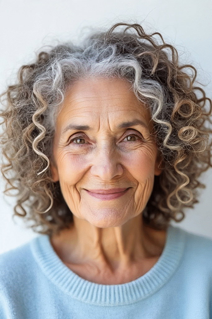 El cabello gris natural con rizos definidos crea un look glamoroso y dinámico que es tanto lujurioso como apropiado para la edad. Este estilo funciona particularmente bien para mujeres con cabello naturalmente rizado u ondulado.